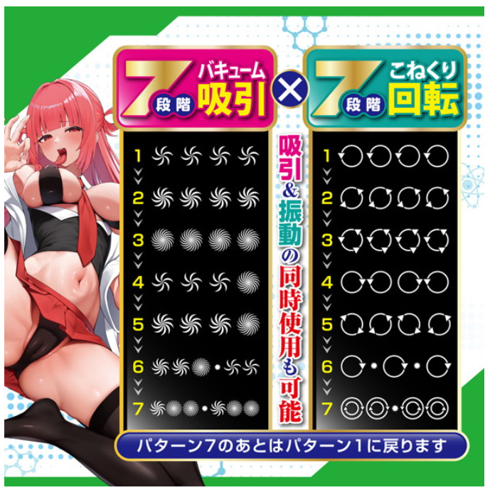 - 7種のピストン運動・7種の回転刺激・7種の振動との組み合わせで、まさに全方位からの快楽攻撃。