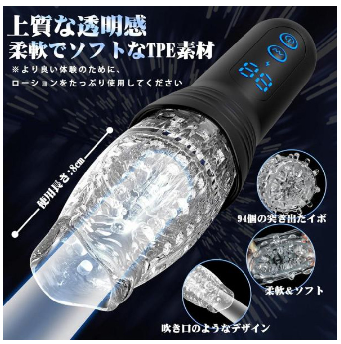 - 高品質TPE素材の絶妙な柔らかさと質感の内部は94個の突起付き3D刺激構造を採用し、圧倒的な包み込み感と射精感。