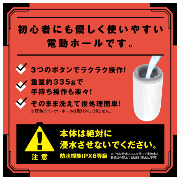 - 冷水やお湯を入れて水圧や水流でのオナニー体験が可能。IPX6防水仕様で、使用後はスリーブを簡単に取り外して洗浄可能で清潔。