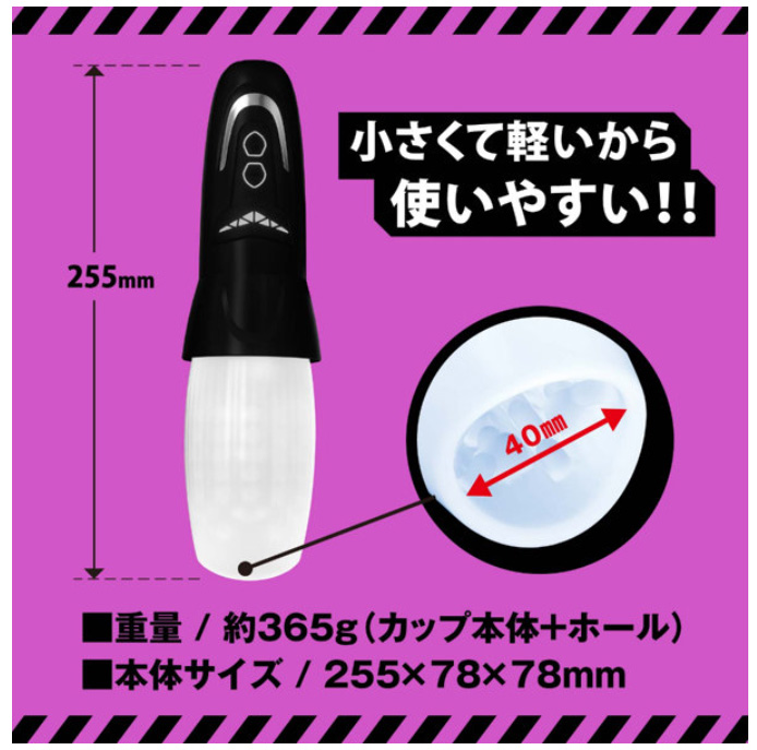 - 執拗な回転で裏スジに刺激を与える、まったりと刺激を楽しめる小型電動オナホ。重量はわずか約347gで手持ち操作も楽々。