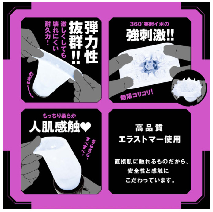 - 高品質なエラストマー製でやや柔らかめ寄りのオナホールの中には大粒のイボがたっぷり。ブリュブリュとペニス全体に絡みついて抜きに来ます。