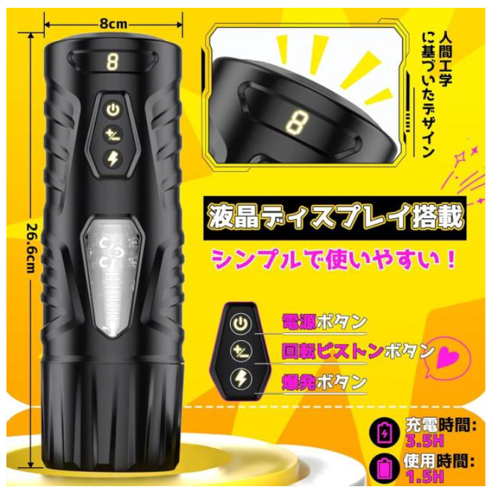 回転ピストンと振動、3つの動作で刺激を与え、搾り取る、小型で扱いやすい電動オナホール