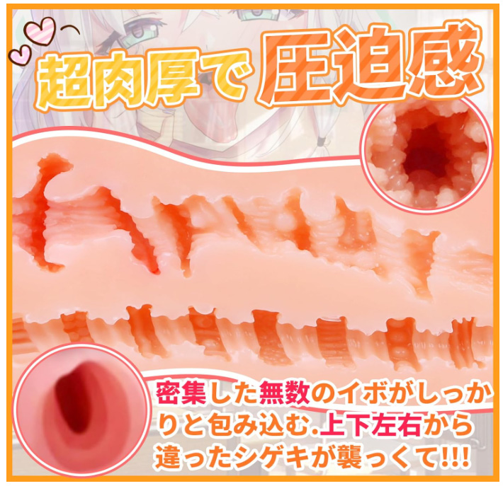 官能的な唇にリアルな歯までも再現した“甘噛みリップ”と、キュートなすじまん造型の奥に締め付けリングを施した、“超快感ぎゅんぎゅんヴ◯ギナ”。前後両方向でまったく異なる2つの刺激が楽しめる、デュアルサイドホールの第2弾です。