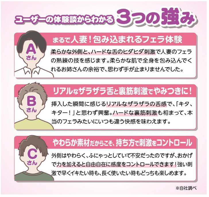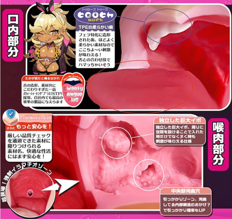 1.亀頭裏を包むぷるぷる舌 2.ダブルのヒダ付き突起で亀頭に2つの悶絶刺激 3.喉奥では亀頭、カリを上・前・下から刺激。イボ、ヒダ、突起、3種類の刺激