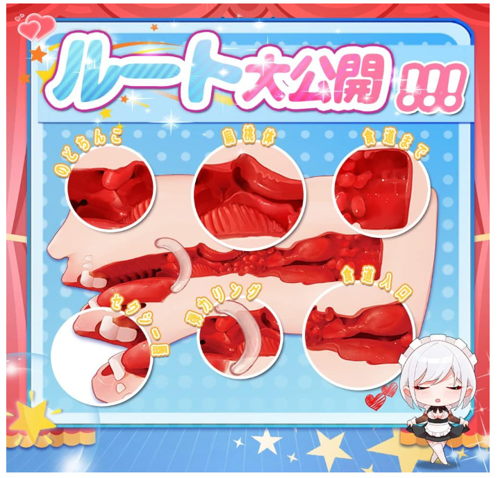 • 内部構造は大中小と舌パーツが3つもあって、上顎にはのどちんこをイメージした2本の極太ヒダが奥までつづいています。つまり舌3枚、のどちんこ2つということです。実際にいたら化け物ですね。ただし、外見はかわいらしい女性のリアルな唇を造形しており、挿入してみないとその奇形っぷりはわかりません。「気持ちよければリアルなんてかんけーねえ!」の姿勢はありでしょう。
