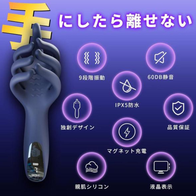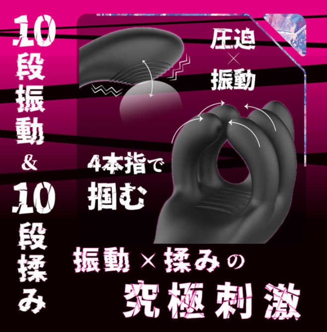 振動と揉み動作で刺激する5本指の手コキ仕様亀頭マッサージャー。特に揉み刺激は格別の快感。