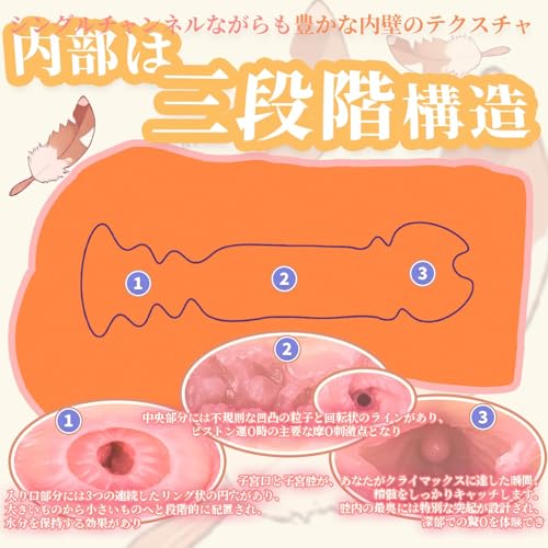 - 内部は「もっちり挿入口」「スパイラルツブツブエリア」「ツブイボ密集エリア」「吸引ウェーブエリア」の4つのゾーンで構成。女子の内部を再現したリアルな無次元構造で、むっちりとした挿入感ととろけるような快感を楽しめます。