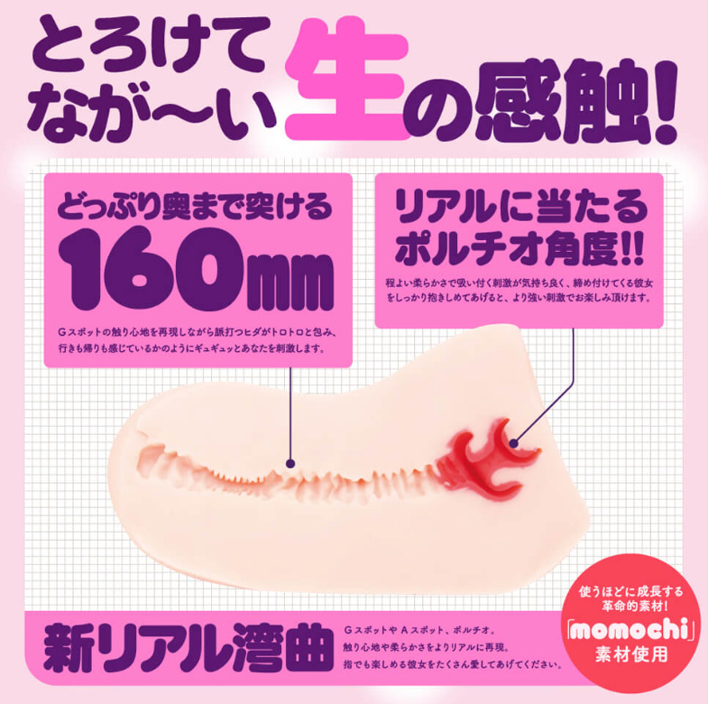 - オリジナル素材「ピュアソフト」を採用。女性の健康的かつふんわりとした肌、入れた時のトローリ感を再現した優秀な素材。