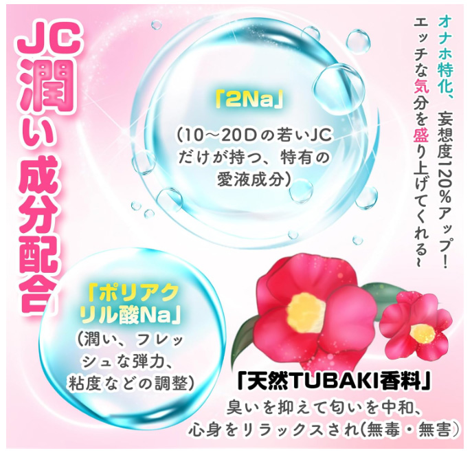- 10~20代の若いJCだけが持つ、特有の愛液成分「2Na」を配合したことで若いJC特有の潤いを表現。潤いとフレッシュな弾力を調整するポリアクリル酸Naも配合。