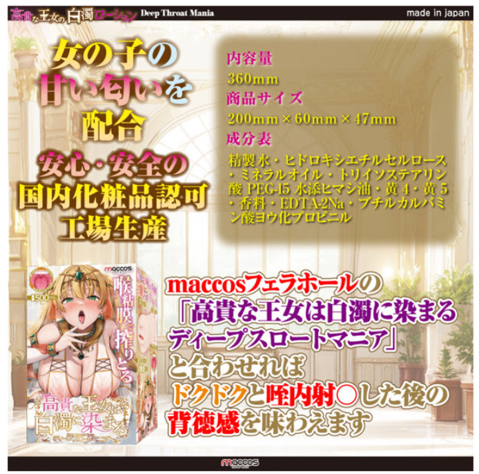 非貫通オナホ「maccos japan 高貴な王女は白濁に染まる ディープスロートマニア」のために作られた商品ですが、ローション単体での売り上げが圧倒的に多いです。まさに王女を思わせる華やかな香りが癖になっている人がけっこういらしゃるのかもしれません。
