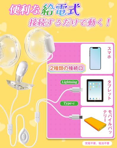 - USB給電式。2種類の接続端子があり、スマホやモバイルバッテリーなどお手元の機器から給電。