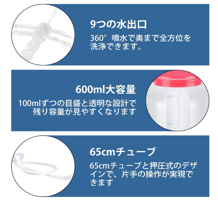 押圧式の多目的洗浄器:独特な設計と構造で、ノズル先端には9つの水出口があり、360°噴水で奥まで全方位を洗浄できます。600ml大容量、100mlずつの目盛と透明な設計で残り容量が見やすくなります。また、65cmチューブと押圧式のデザインで、片手の操作が実現できます