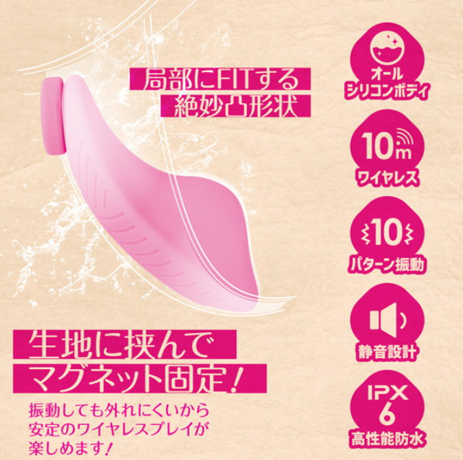 - 振動する突起部を膣口に当てつつマグネットでショーツへ固定するため、位置ズレ・脱落しにくいのが最大の利点です。