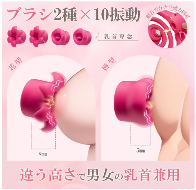 - 10種振動パターン。また、4つの突起が乳首を刺激する花型、舌が乳首を刺激する唇型の2種アタッチメント付属で20種類の刺激が楽しめます。花型アタッチメントは8㎜/唇型アタッチメントは5㎜の厚さで、男性の乳首の高さも意識。アタッチメントは磁気吸着式で、パチッと簡単に取り付け、取り外し可能。