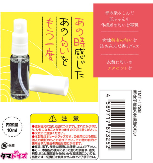 - 女子校生の汗とフェロモンが混ざった体操着の匂いを再現した、スプレーして使えるタマトイズの匂いフェチ系香水です。