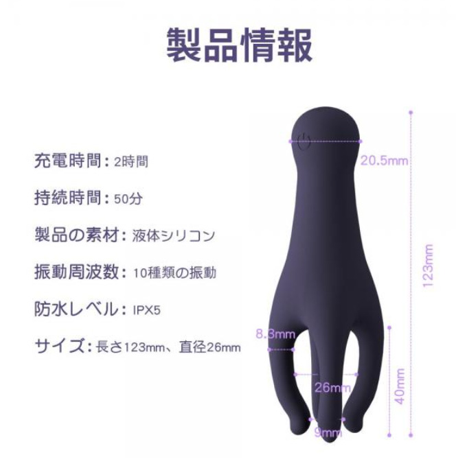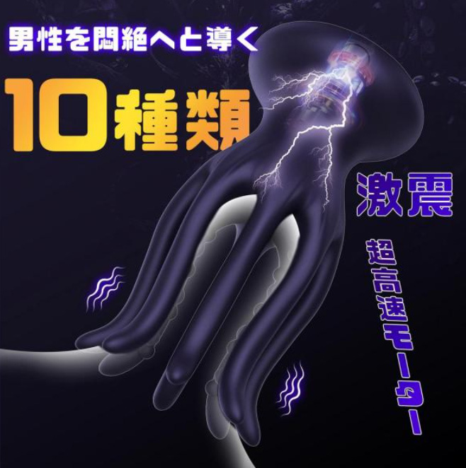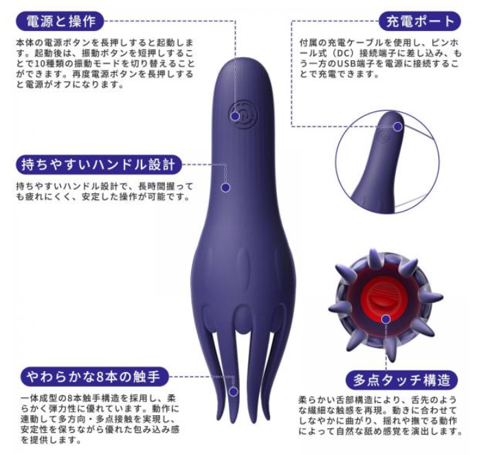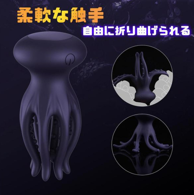 - 8本の柔らかいイボ付き触手と丸型ベースで構成された、まさに「タコ」型デザインの亀頭バイブです。先端にイボがついた触手が、まるでタコの足のように亀頭を包み込み、振動刺激を提供。